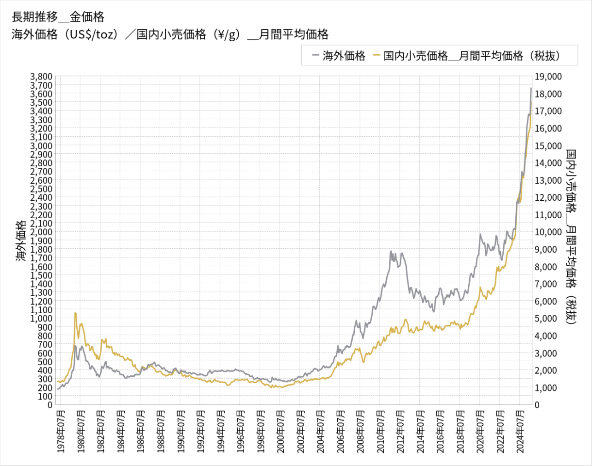 1978年~2025年の国内・海外の金価格の推移は上記の通りであり、全体で考えれば右肩上がりに上昇を続けてきたことがわかります。