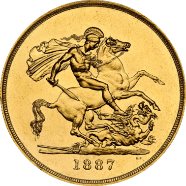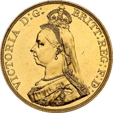 ヴィクトリア女王の肖像を描いたコインのデザインはイギリス本国では大きく分けて4タイプ存在しますが、これだけの肖像タイプが存在するというのは、ヴィクトリア女王がとても長い年月まで玉座に君臨していたことの表れです。今回ご紹介するヴィクトリア女王の肖像はジュビリーヘッドタイプで、1837年に即位して50年統治を記念して作られた肖像タイプです。オールドヘッドタイプと2種存在しますが、この頃のイギリスは様々な国を支配し領土を広めていたことからヴィクトリア女王の影響は絶大でした。経済的影響やその「重さ」から、王冠を被ってると言われております。54,000枚と大量生産されたことから、丁寧に扱われていなかったため、今回のUNC(未使用)という状態は非常に珍しく貴重な状態。イギリスコインは全世界で最も人気の高いコインで、その中でも5ポンド金貨が最も人気があるシリーズです。
