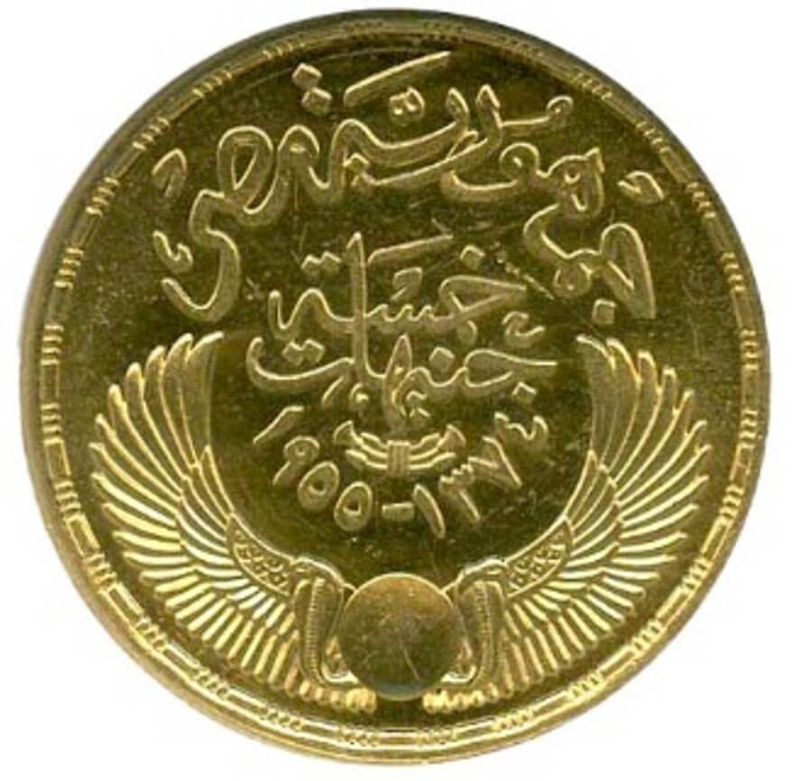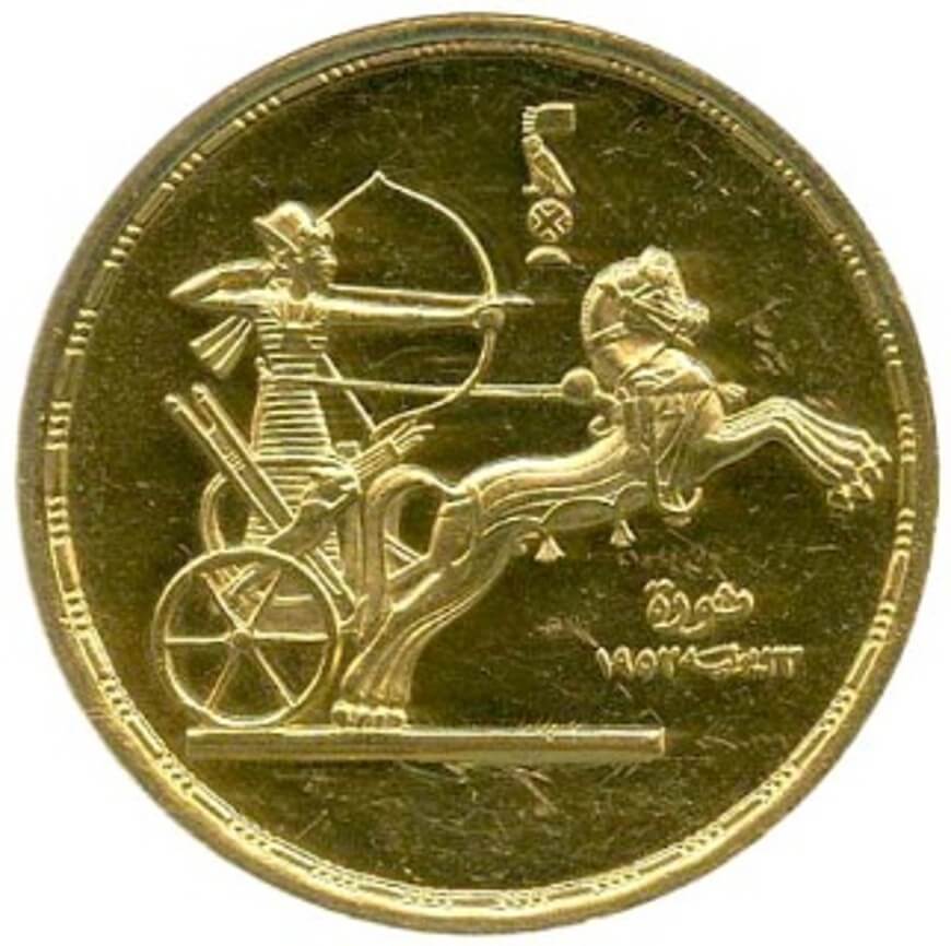 古代エジプトを偲ぶデザインは自由将校団によるエジプト革命により王政から共和制になった3周年を記念し発行されました。他に5周年を記念して発行されたものと2種類ございます。表のデザインは、ラムセス2世(紀元前1314頃 – 紀元前1224年)が古代戦車(チャリオット)を動かし弓を引いているデザインとなっていて、大型で人気のある金貨です。ラムセス2世は、紀元前1,300年から紀元前1,200年頃のファラオ(王様)です。ラムセス2世のミイラが、エジプト考古学博物館で保管されています。馬の前足と後ろ足が4本ずつに見えますが、これは馬が2頭いる姿を表現しています。古代エジプトでは、人物等の遠近感を出すために、絵を重ねる技法が使われました。1955年はイエローゴールド、1957年はレッドゴールドと色味の違いがあります。金品位が0.875のため約12.5%は金以外のもので構成されており、銀が多いとイエローゴールド、銅が多いとレッドゴールドとされています。ピンクゴールドはパラジウムが入っていたりと同じ金貨でも色味が違うのはこのためです。