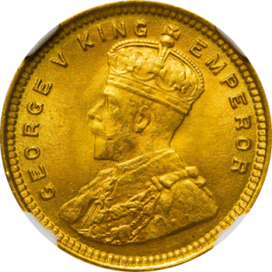 英領インドは、1858年から1947年のインド独立まで、イギリスによって支配されたインド亜大陸の領域を指します。イギリス東インド会社が18世紀末からインドの支配を強め、1857年のインド大反乱の後、東インド会社の統治が廃止され、イギリス政府が直接統治する体制が確立されました。この体制下でインドは「イギリス領インド帝国」として統治され、総督が国王の代理として現地統治にあたりました。ジョージ5世はエドワード7世の第二子として1865年6月3日に生まれました。1910年に即位し、彼の治世中に第一次世界大戦(1914-1918)が勃発。戦後、インドを含む植民地にも経済的影響が広がり、通貨における金の流通が戦略的に重視されました。第1次世界大戦期には、前線に何回も訪れ兵士を奨励し、また負傷兵の見舞いにも訪れる人望が厚く評判の良い国王でした。15ルピー金貨には、表面にジョージ5世の右向き肖像が刻まれており、肖像の周囲には「GEORGE V KING EMPEROR(ジョージ5世 国王 皇帝)」という称号が刻印されています。これは、イギリス国王がインド皇帝としても君臨していたことを示しており、イギリスの支配と皇帝としての権威が強調されています。裏面には「15 RUPEES INDIA 1918」という刻印があり、文字は簡素であるものの、当時のインドでの通貨単位と発行年が強調されています。発行枚数は211万枚と記録されていますが、状態の良いものは少なく、MS65 のような高鑑定品は市場価値が高く評価されています。本コインはTopPop(最高鑑定品)MS65+に次ぐ準TopPop品です。