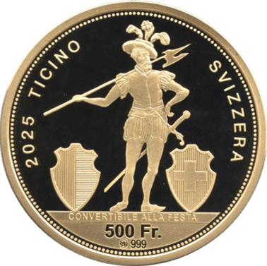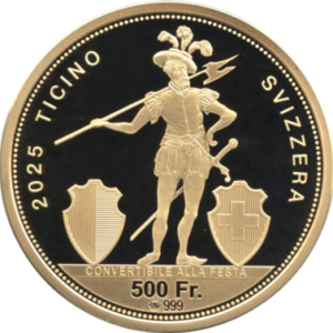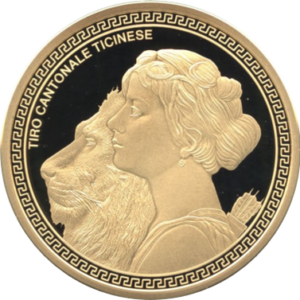 表面には、スイスを象徴する寓意的な女性ヘルヴェティアの横顔が描かれ、その左側には力強さと勇気、権威を象徴するライオンが描かれています。裏面には、1814年のティチーノ州4フラン銀貨に描かれた武装兵士のほぼ完全な複製が描かれ、その両側にはスイスとの盾が描かれています。額面の上には、イタリア語で「祭典で兌換可能」という文字が記されており、この金貨の法的地位を示しています。射撃祭の起源は15世紀の旧スイス連邦時代にさかのぼり、ウィリアム・テルの伝説にも通じるクロスボウによる射撃大会がその始まりとされています。こうした歴史ある行事を記念して、19世紀から続く伝統に基づき、特製の記念金貨・銀貨が毎年発行されています。「ティチーノ州射撃フェスティバル」という名称からは一見、ティチーノ州内の地域的なイベントのように思われがちですが、実際にはスイス全土からの参加者を広く歓迎する全国規模の射撃大会です。特にドイツ語圏スイスやロマンディ地方といった他の地域からも、多くの射撃愛好家がこのイベントを目指して来場します。2025年には、スイス国内で計3つの射撃フェスティバルが開催される予定ですが、その中でもティチーノ州で行われるこのフェスティバルは、特に注目を集める一大イベントとなることでしょう。参加者数は約8,000人から9,000人にのぼると見込まれており、地域を超えて多くの人々が一堂に会する、スイスの射撃文化を象徴する貴重な機会となります。