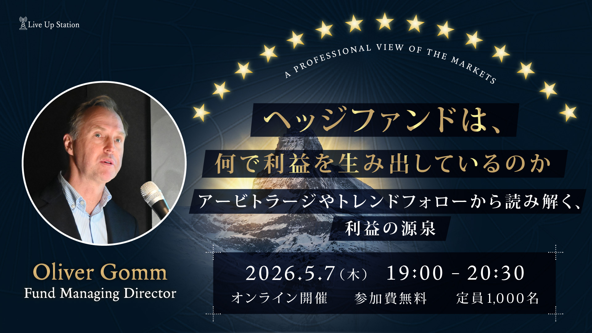 本セミナーでは、アービトラージやトレンドフォローといった代表的な考え方を入口に、ヘッジファンドがどのように利益を生み出そうとしているのか、その発想と仕組みをわかりやすく解説します。市場環境に応じて運用の比重を柔軟に変える視点や、独自の収益機会を狙う手法にも触れながら、プロの運用に通底する考え方を紐解きます。